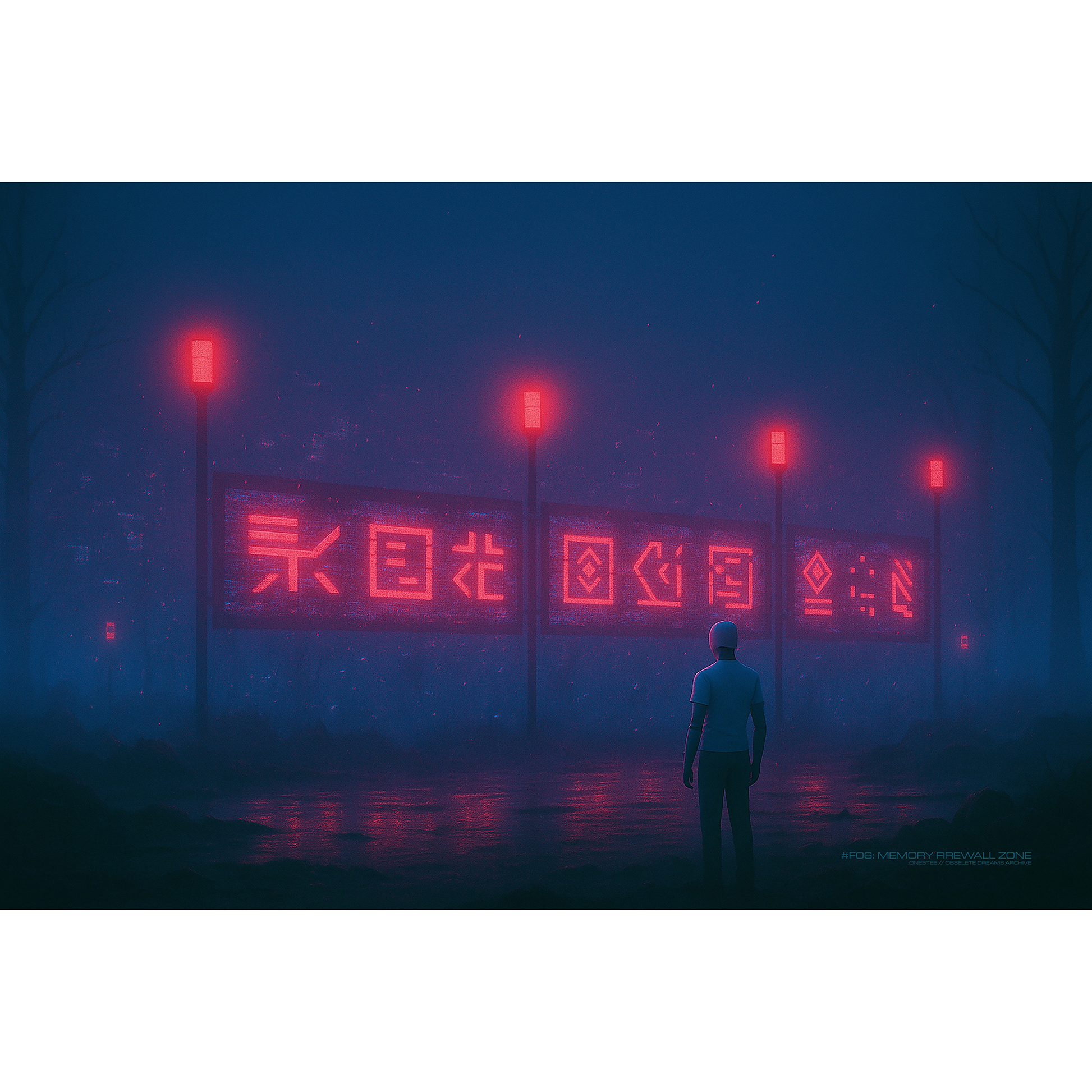 Standing at the boundary of remembrance, the mannequin faces red beacons and glitching glyphs. A border between allowed and erased, known and denied.